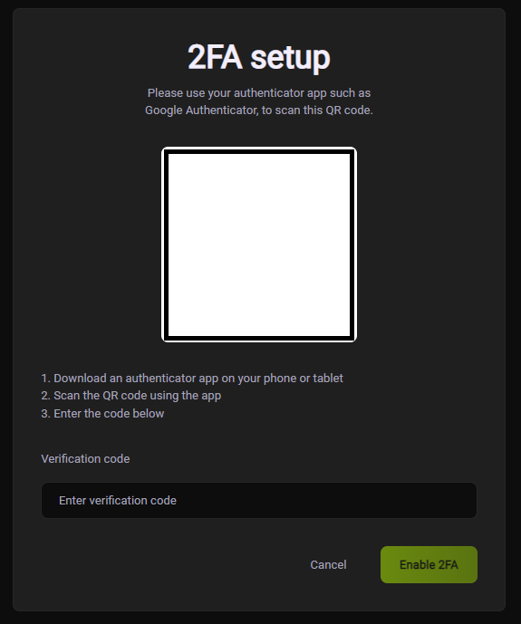 4\. Enter the verification code from your smartphone and press ‘Enable 2FA’.